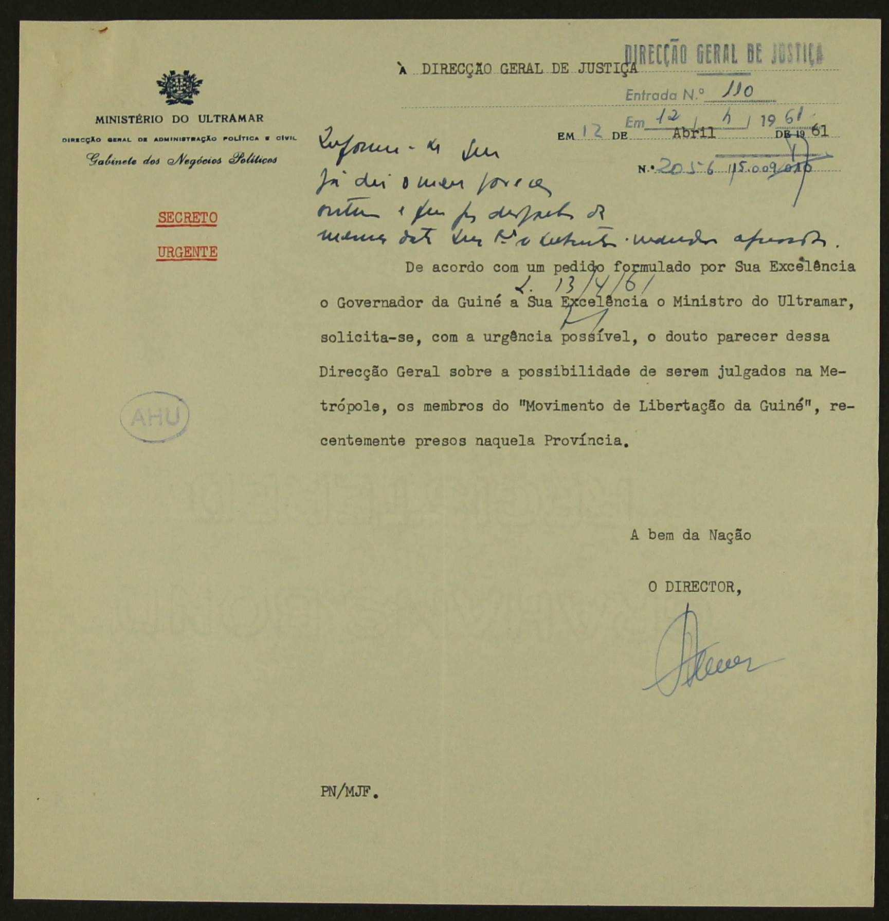 O AHU assinala o 25 de abril de 1974, destacando o documento, datado de 12 de abril de 1961, que regista o pedido urgente do Governador da Guiné para obter parecer sobre a possibilidade de julgar na Metrópole membros do Movimento de Libertação da Guiné.